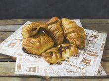 Bakery greaseproof sheets. Perfect for pastries and all ranges of sandwiches. Made from sustainably-sourced, chlorine-free paper. White with brown 'bakery' word cloud print. Award-winning quality by Vegware, made from plants. Commercially compostable where